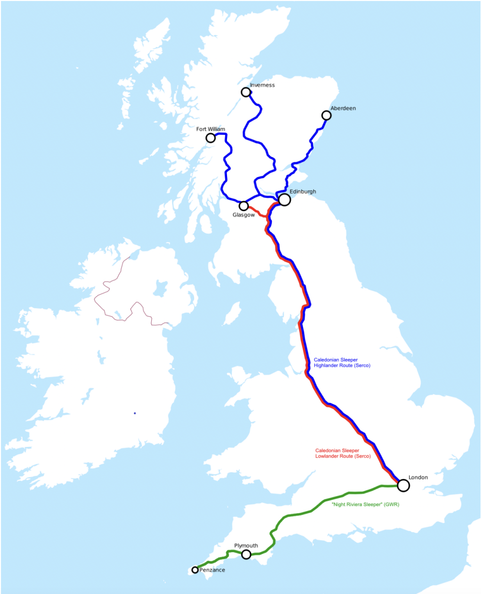 In Groot-Brittannië rijden er vanuit Londen in twee richtingen nachttreinen. Zo heb je de Caledonian Sleeper die rijdt van London naar Schotland (Edinburgh, Glasgow, Fort William, Aberdeen en Inverness) en heb je de Night Riviera Sleeper. Die rijdt tussen Londen en het meest westelijke puntje van Engeland, naar Penzance.