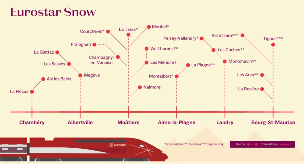 - Amsterdam – Schiphol Airport – Rotterdam – Antwerpen – Brussel Zuid – Chambéry-Challes-les-Eaux, Albertville, Moûtiers Salins-Brides-les-Bains , Aime la Plagne – Landry – Bourg St. Maurice (alleen in de winter)
