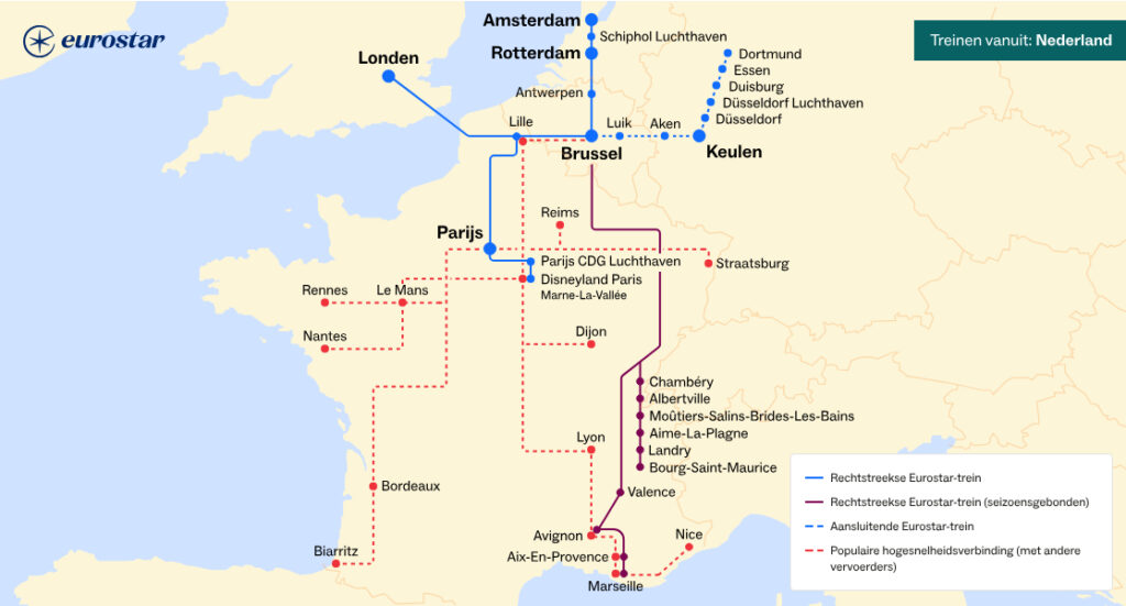 - Amsterdam – Schiphol Airport – Rotterdam – Antwerpen – Brussel Zuid – Marne-la-Vallée Chessy (wekelijks)