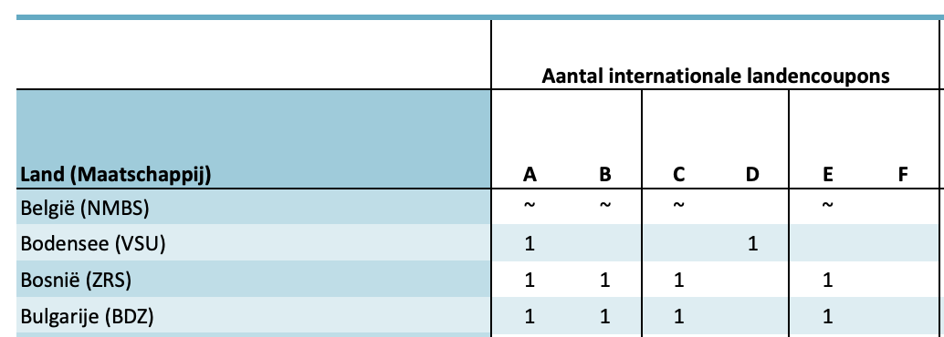kolom E (coupons per jaar voor partner/kind van oud-werknemers die minstens 11 jaar bij NS hebben gewerkt.