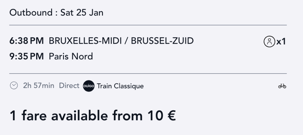 Tijdens de Olympische Spelen in Parijs in 2024 reed NMBS een Eurocity tussen Brussel-Zuid en Parijs in 2u52m. NMBS en SNCF rijden per dienstregeling 2025 deze Ouigo Train Classique drie maal daags en dat maakt het dan ook een mooi alternatief voor de Eurostar. Deze treinen stoppen tussen Brussel-Zuid en Paris-Nord ook in Bergen/Mons, Creil en Aulnoye-Aymerie. De ticketprijzen schommelen tussen 10 en 59 euro voor een enkele reis en zijn plaats gebonden (kinderen jonger dan 12 jaar betalen een vaste prijs van 8 euro voor een reis tussen Frankrijk en België). FIP is helaas niet geldig is op deze treinen.